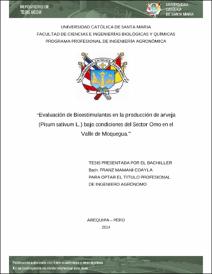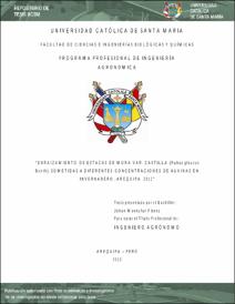 Ítem Acceso Abierto Diseño, Construcción y Funcionamiento de un Módulo de Enraizamiento de Sauco (Sambucus Peruviana H.B.K), Utilizando Tres Tipos de Sustratos y Tres Dosis de Ana (Ácido Naftalenacético), en el Fundo “La Anda”.Huasacache. 2011(Universidad Católica de Santa María, 2001-08-13) Cárdenas Dávila, Mijahel Gonzalo; Paredes Cornejo, Alejandrina NathalyCultivo de Sauco Distribución y Hábitat Clasificación Taxonómica Descripción de la Planta Requerimientos Multiplicación Principios Activos del Sauco Usos Hormonas y Reguladores de Crecimiento Auxinas Giberelinas Cito Quininas Etileno y Poliaminas Bases Fisiológicas de la Iniciación de Raíz en Estacas Sustratos Trabajos de Investigación RealizadosÍtem Acceso Abierto Evaluación de Tres Densidades de Siembra del Forraje Maralfalfa (Pennisetum Sp) en la Irrigacion Majes- Arequipa 2011 /2012.(Universidad Católica de Santa María, 2005-08-13) Meza Cerna, Katyana LissettMaralfalfa (Pennisetum Sp.) Origen e Importancia Clasificación Taxonómica Composición Química Características del Genero Pennisetum Densidad de Siembra en Gramíneas Bromatología Materiales y Métodos Ubicación del Experimento Historial del Campo Ecología del Lugar Características Climáticas Materiales Métodos y Procedimientos Tratamientos en Estudio Diseño Experimental Diseño Estadístico Características del Área Experimental Metodología Trabajos de Campo Preparación del Terreno Marcado del Experimento Siembra Control de Malezas Aporque Fertilización Riegos Control Fitosanitario Cosecha o Corte Características Evaluadas Altura de Planta Numero de Hojas Numero de Macollos Diámetro de Macollos Rendimiento en Forraje Verde Análisis Nutricional de Maralfalfa Resultados Discusión ConclusionesÍtem Acceso Abierto Efecto del Abonamiento Organico en Base a Compost y Biol en el Rendimiento del Cultivo de Lechuga (Lactuca Sativa L.) Var. Capitata en la Joya Antigua(Universidad Católica de Santa María, 2005-08-13) Niño De Guevara Zegarra, Mario ReneImportancia del Cultivo de Lechuga Taxonomía y Características Botánicas Necesidades de Clima y Suelo Importancia del Abonamiento Orgánico Compost Biol Material y Métodos Historial del Terreno Experimental Condiciones de Clima Condiciones de Suelo Descripción de los Tratamientos Diseño Experimental y Tratamiento Estadístico Características de la Parcela Experimental Labores Agronómicas del Cultivo Preparación de Terreno Trasplante Abonamiento Riegos Control Fitosanitario Control de Malezas Cosecha Evaluaciones Resultados Prendimiento Altura de Planta Diámetro de Planta Rendimiento Total Rendimiento Clasificado Discusión ConclusionesÍtem Acceso Abierto Aplicacion de Herbicidas Post –Emergentes para el Control de Malezas en el Cultivo de Cebolla (Allium Cepa L.) Roja Italiana bajo Condiciones del Valle de Tambo - Arequipa 2011(Universidad Católica de Santa María, 2013-01-18) Portales Torres, CarlosMalezas Clasificación de las Malezas Ecología de las Malezas Mecanismos de Supervivencia de las Malezas Lucha contra las Malezas Prevención Erradicación Control Coquito Importancia Botanica Identificación y Descripción Habitad Biología y Ecología Herbicidas Clasificación de los Herbicidas A. por Su Método de Aplicación por Su Comportamiento en la Planta por Su Comportamiento en El Suelo por Su Estructura Química Aspectos Fisiológicos de la Acción Herbicida Interacción de los Herbicidas con El Medio Ambiente Cebolla Origen Clasificación Taxonómica Características Cultivar en Estudio Descripción de las MalezasÍtem Acceso Abierto Fluctuación Poblacional de Plagas y Enemigos Naturales en el Cultivo de Palto (Persea Americana Mill) C.V. “Hass” en la Irrigación de Majes. Septiembre 2011- Septiembre 2012.(Universidad Católica de Santa María, 2013-08-23) Alvarado Mamani, Nilda EsmilaGeneralidades de la Especie en Estudio Clasificación Botánica Origen Razas y Variedades Fluctuación Poblacional Plagas de Palto Trips Arañita Roja Chanchito Blanco Chinche del Palto Bicho del Cesto Gusano Medidor Mosca Blanca Gigante Escama Pequeña del Palto Controladores BiológicosÍtem Acceso Abierto Rehabilitación de Áreas Disturbadas por la Minería, con Vías a Lograr Su Sostenibilidad, Al Cierre de las Operaciones(Universidad Católica de Santa María, 2013-10-30) Medina Peralta, Elvis JavierDesarrollo Sostenible Aspecto Socio Económico Aspectos Físicos Clima Aspecto BiológicoÍtem Acceso Abierto Implementacion de un Laboratorio de Postcosecha de Frutas y Hortalizas: Evaluacion de Postcosecha en Durazno (Prunus Pérsica L.), Naranja (Citrus Sinensis B.) Tomate (Lycopersicum Sculemtum Mill) en Diferentes Grados de Madurez en el Fundo la Banda Huasacache – Arequipa.(Universidad Católica de Santa María, 2013-11-27) Bernedo Cochon, José Luis; Cahuina Lazaro, Cesar AugustoOrigen y Distribución del Cultivo de Durazno Clasificación Taxonómica Índices de Cosecha Recolección Valor Nutricional Postcosecha Fisiopatias Enfermedades Normas de Calidad para Duraznos Destinados Al Consumo en Estado Fresco Origen y Distribución del Cultivo de Naranja Clasificación Taxonómica Índices de Cosecha Recolección Postcosecha Fisiopatias Enfermedades Origen y Distribución del Cultivo de TomateÍtem Acceso Abierto Efectos de la Aplicación de Sustancias Húmicas y Micro-Organismos Eficaces Dirigidas Al Suelo, en el Rendimiento y Calidad del Fruto del Cultivo de Sandia (Citrullus Lanatus L), en la Irrigacion la Cano – Arequipa 2012(Universidad Católica de Santa María, 2014-01-23) Franco Pinto, Magaly GiulianaOrigen y Distribución del Cultivo de la Sandia Clasificación Taxonómica Cultivar Morfología Exigencias del Cultivo Labores Técnicas y Culturales del Cultivo Microorganismos Eficientes Autóctonos Bioem Ácidos Húmicos AntecedentesÍtem Acceso Abierto Respuesta de Tres Variedades de Lechuga (Lactuca Sativa L.) Producidas en un Sistema Aeropónico bajo las Condici