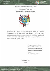 Ítem Acceso Abierto Prevalencia de Maloclusiones Dentarias en Escolares de 12 a 17 Años de Edad en el Distrito de Wanchac, Cusco - 2015(Universidad Católica de Santa María, 2015-08-21) Quispe Chauca, Jorge LuisEl objetivo de esta investigación fue determinar la prevalencia de las maloclusiones dentales en los escolares de 12 a 17 años de edad en los colegios estatales del distrito de Wanchac de la ciudad del Cusco en el periodo 2013. Se utilizó el diseño de estudio no experimental, donde la metodología de la investigación fue científica y el enfoque de investigación cuantitativo. El trabajo de investigación es de tipo observacional, descriptivo, prospectivo, transversal y se realizó en los alumnos de primero a quinto de segundaria de los colegios estatales del distrito de Wanchac de la provincia del Cusco durante el periodo 2013. De una población de 5767 se tomó una muestra de 250 alumnos entre varones y mujeres, la muestra fue obtenida de manera aleatoria de los distintos colegios. A los alumnos se les valoró clínicamente: el perfil facial en el sentido anteroposterior y vertical, la valoración de la maloclusión en relación al plano anteroposterior, vertical y transversal, así como las anomalías volumétricas referidos al diastema y apiñamiento dentario, para lo cual se aplicó una ficha de observación clínica validada por la Universidad Católica de Santa María de Arequipa y utilizada en el levantamiento epidemiológico en los diferentes distritos de la ciudad de Arequipa en el año 2006. Los resultados mostraron que con respecto al perfil anteroposterior el perfil recto fue el que tuvo el mayor porcentaje con 64.8%, el perfil vertical normo divergente se presentó con un mayor porcentaje 55.20%, , con respecto a la relación molar derecha e izquierda la clase I tuvo la mayor frecuencia con el 72.8% y 75.2% respectivamente, La relación canina derecha e izquierda se encontró con mayor frecuencia la clase I con 72.8% y 76.4% respectivamente, la sobremordida horizontal (over jet) se encontró un 70% de normalidad, mordida abierta fue de 8.4%, la sobremordida vertical (over bite) fue del 71.2% de normalidad, mordida cruzada posterior fue del 8.8%, apiñamiento dentario con un 29.6% y mordida abierta de 11.6%. Con respecto a la oclusión dentaria se encontró una prevalencia de la maloclusión del 92% la normoclusión fue del 8%, Con respecto al tipo de maloclusión dentaria se encontró una prevalecía de maloclusión clase I de 68.8%, clase II de 12.8% de esta clase II 1 de 8.8%, clase II 2 de 4.0% y la clase III con un 10.4%. Se concluye que la prevalencia de maloclusión dentaria en los escolares de 12 a 17 años de edad del distrito de Wanchac de la ciudad del Cusco en el periodo 2013 es del 92%.Ítem Acceso Abierto Perfil Epidemiológico de la Salud Oral en Escolares de 12 a 17 Años de la Ciudad de Tacna. 2014(Universidad Católica de Santa María, 2015-08-21) Ortega Cordero, Mariela AlejandraEl objetivo de este trabajo fue conocer el perfil epidemiológico de los alumnos de las diferentes instituciones educativas de la ciudad de Tacna, de nivel secundario. En el presente trabajo se estudiaron las Fichas Epidemiológicas, previamente tomadas y recolectadas, de dichos estudiantes, cuyas edades fluctúan entre 12 a 17 años, de ambos sexos. Así pues se ha observado que los escolares de dicha Institución Educativa presentaron un Índice de Higiene Oral (índice que mide la superficie del diente cubierta por desechos y cálculo) en promedio de 1.65 lo que correspondería a un índice aceptable. En cuanto al índice Periodontal de Russel (índice que evalúa el estado periodontal, basándose en la presencia de inflamación gingival, bolsa periodontal o movilidad dentaria) los escolares presentaron un periodonto normal en un 55.6% lo que correspondió a 140 estudiantes. Por otro lado los escolares presentaron un Índice de Caries (índice que mide la sumatoria de dientes cariados, perdidos y obturados) en promedio de 7.5 que correspondería a un índice grave. Finalmente, en cuanto al índice de Maloclusiones, predomina el apiñamiento en el maxilar inferior; así como el perfil recto tanto en sentido ántero-posterior como en sentido vertical, y un overjet y overbite promedio entre 2 a 4 mm.Ítem Acceso Abierto Relación del Presupuesto por Resultados (PPR) en la Ejecución de los Tratamientos Dentales en la Estrategia Sanitaria de Salud Bucal de las Microredes de Salud de Tacna 2014.(Universidad Católica de Santa María, 2015-08-21) Sanchez Macchiavello, Alonso FernandoEl presente estudio tuvo como objetivo principal, estudiar la relación que existe entre el gasto público y la cantidad de atenciones y atendidos , en las diferentes redes y micro redes de la DIRESA TACNA. Se estudiaron todas las redes de salud de Tacna en el período 2012 obteniendose además el consolidado de atenciones (n= 222618) y atendidos ( n=146436) del regristro de estadística HIS del Ministerio de Salud y el gasto de la página web del ministerio de Economía del Péru. La técnica fue observación documental, el análisis estadístico descriptivo que se empleó fue de frecuencias y porcentajes. Los resultados encontrados, nos mostraron que hay una buena ejecución en tratamientos preventivos y recuperativos, y cero actividad en tratamientos especializados, motivo por el cual Tacna, quedó en último lugar de ejecución de estas labores en comparación con otras regiones. El presente estudio demostró mediante la observación de los resultados sanitarios del reporte HIS, que en las Redes de Salud con poca población asignada, el gasto no corresponde a la cantidad de atenciones a diferencia de las otras redes donde el volumen de compra y gasto de recursos es concordante con la ejecución de metas de actividades. La hipótesis se comprobó, mediante la prueba de regresión lineal y el R cuadrado de Pearson.Ítem Acceso Abierto Eficacia de un Programa de Análisis Cefalométrico Com
