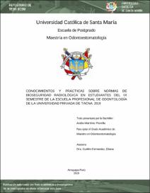 Ítem Acceso Abierto Relación entre el Índice de Necesidad de Tratamiento Funcional y el tipo de cirugía ortognática realizada en pacientes tratados en el Servicio de Estomatología Quirúrgica del Hospital Nacional Arzobispo Loayza, Lima del 2010 al 2023(Universidad Católica de Santa María, 2024-04-23) Montesinos Estaño, Fernando DuanyEsta investigación tiene por objeto relacionar el índice de necesidad de tratamiento funcional y el tipo de cirugía ortognática realizada en pacientes tratados en el Servicio de Estomatología Quirúrgica del Hospital Nacional Arzobispo Loayza. Corresponde a un estudio observacional, retrospectivo, transversal, descriptivo y documental, de nivel relacional, cuyas variables fueron estudiadas mediante la técnica de observación documental de 105 historias clínicas seleccionadas de acuerdo a los criterios de inclusión, y a las que se aplicó una Ficha de Registro. La información obtenida fue procesada y luego tratada estadísticamente a través de frecuencias absolutas y porcentuales. La relación fue analizada mediante la prueba X2 de independencia. En cuanto a los resultados, predominó una necesidad muy grande de tratamiento ortognático con el 42.86% y una gran necesidad del mismo, con el 38.10%. Asimismo, la cirugía ortognática bimaxilar más mentoplastía fue la más realizada, con el 74.29%, seguida por la cirugía ortognática bimaxilar, con el 12.38%. Según la prueba X2, existe relación estadística significativa entre el índice de necesidad de tratamiento funcional y el tipo de cirugía ortognática, con lo que se rechaza la hipótesis nula, y se acepta la hipótesis alterna o investigativa, con un nivel de significación de p < 0.05Ítem Acceso Abierto Evaluación de la microfiltración de tres resinas tipo Bulk en restauraciones clase II según la fuente de polimerización. Arequipa 2019(Universidad Católica de Santa María, 2024-01-03) Castillo Guillén Claudia MaríaEl objetivo principal de estudio fue identificar el grado de microfiltración de tres resinas tipo bulk en restauraciones clase II según la fuente de polimerización. El estudio fue de tipo experimental in vitro, analítico, transversal y prospectivo. La hipótesis planteada refiere que puede que existan diferencias en el grado de microfiltración de tres tipos de resina bulk empleadas para las restauraciones clase II según el empleo de diferentes fuentes de polimerización. Se emplearon terceros molares que fueron preparados y seccionados según los criterios de inclusión y exclusión; se empleó como instrumento una escala para valorar la microfiltración marginal cervical (método de Chuang), los datos se transfirieron al software ImageTool para medir la penetración del azul de metileno. Posteriormente los datos fueron procesados y analizados estadísticamente en el programa SPSS para Window en su versión 22.0 (SPSS Inc., Chicago, IL, USA). Para estimar la concordancia intra- observador se empleó la prueba Kappa de Cohen. Como los valores de la microfiltración fueron reportados en escala ordinal, se empleó la prueba de Kruskal- Wallis para evaluar la diferencia entre grupos; para evaluar las diferencias pareadas entre las muestras intra grupo se empleó la prueba U de Mann- Whitney. Se estableció un nivel de significancia del 5%. Los resultados encontraron que la resina con menor filtración fue la Filtek Bulkfill con n= 16 (en score 0 de microfiltración) lo que equivale al 53.3% de las muestras; seguida de la Sonicfill n= 5, que corresponde al 16.6 % de las muestras y de la Tetric n ceram Bulkfill con n=2, siendo esto un 6.7% de las muestras. La resina con menor nivel de filtración marginal fue la Filtek Bulkfill (3M ESPE) asociada al uso de la fuente de fotopolimerización Bluephase (IVOCLAR) con 6 de los especímenes de prueba que alcanzaron un score de 0 de microfiltración. En conclusión existen diferencias en el grado de microfiltración de tres tipos de resina bulk empleadas para las restauraciones clase II con el empleo de diferentes fuentes de polimerización.Ítem Acceso Abierto Factores asociados a la calidad de atención odontológica percibida por los usuarios que acuden al Centro estomatológico de la Universidad Andina del Cusco, 2023(Universidad Católica de Santa María, 2023-11-20) Beizaga Tejada, YuliLa presente investigación tuvo como objetivo principal relacionar los factores asociados con la calidad de atención odontológica percibida por los usuarios que acudieron al Centro Estomatológico de la Universidad Andina del Cusco” periodo 2023. La recolección de los datos fue mediante la técnica del cuestionario para ambas variables del estudio. La población estuvo constituida por 175 usuarios que acudieron al Centro Estomatológico de la Universidad Andina del Cusco cuyas edades fueron ente 18 a 83 años quienes estuvieron en el momento de la aplicación del instrumento de investigación. La metodología que se aplicó fue mediante el enfoque cuantitativo, descriptivo relacional, transversal y prospectivo, el instrumento tiene validez externa mediante juicio de expertos e interna mediante el estadístico del Alfa de Cronbach con 0,918. Los resultados obtenidos de las variables del estudio con respecto a los Factores Intrínsecos fueron los que tenían la edad entre 18 a 30 años (45.7%), prevalece el género femenino (59.4%), tienen trabajo independiente (68%), grado de instrucción (29.1%) fueron de secundaria completa e universitaria incompleta, en cuanto a los Factores extrínsecos: se enteraron por recomendación (62.9%), facilidad para llegar al establecimiento (26.3%), orientación de señalizaciones (51.4%); la variable Calidad de atención de acuerdo a las dimensiones como: la fiabilidad fue buena (45%), elementos tangibles muy buena (40%), capacidad de respuesta muy buena (42%), seguridad buena (43%), empatía buena(44%). Se concluye que existe relación estadística significativa de Rho de Spearman con un predomin